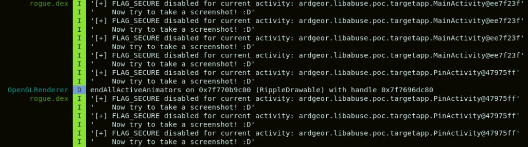 Thinking as an attacker about a real scenario, it would be great to disable the flag FLAG_SECURE on the PIN activity and add functionality to take screenshots or record the screen, as well as support to send information to a server controlled by the attacker. As we plan to make calls at the Java layer, it would be more convenient to write Java code, generate a DEX file and load it from librogue.so.