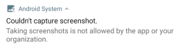 Hence, when this flag is set, capturing the screen is not allowed by the system. For instance, if we try to record the screen it will be shown in black; and if we try to take a screenshot through a button combination, it will not be allowed and a message like the one in the picture below will be shown: