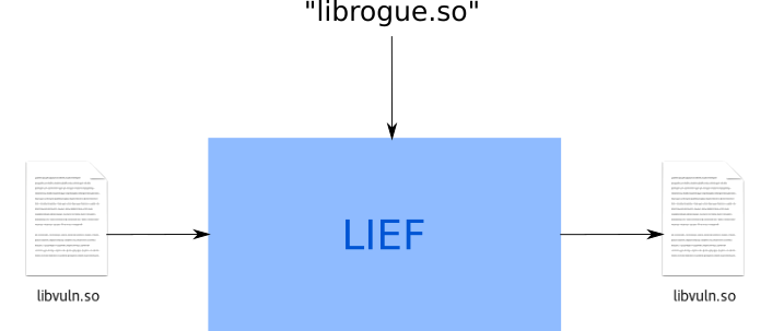 As depicted below, LIEF takes as input the library to modify, and the name of the library to add as a dependency. The binary produced as a result, will include the name librogue.so as a needed library.
