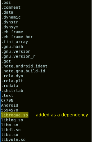 By inspecting the strings of the binary produced, we can confirm that librogue.so had been added to the list of libraries to load: